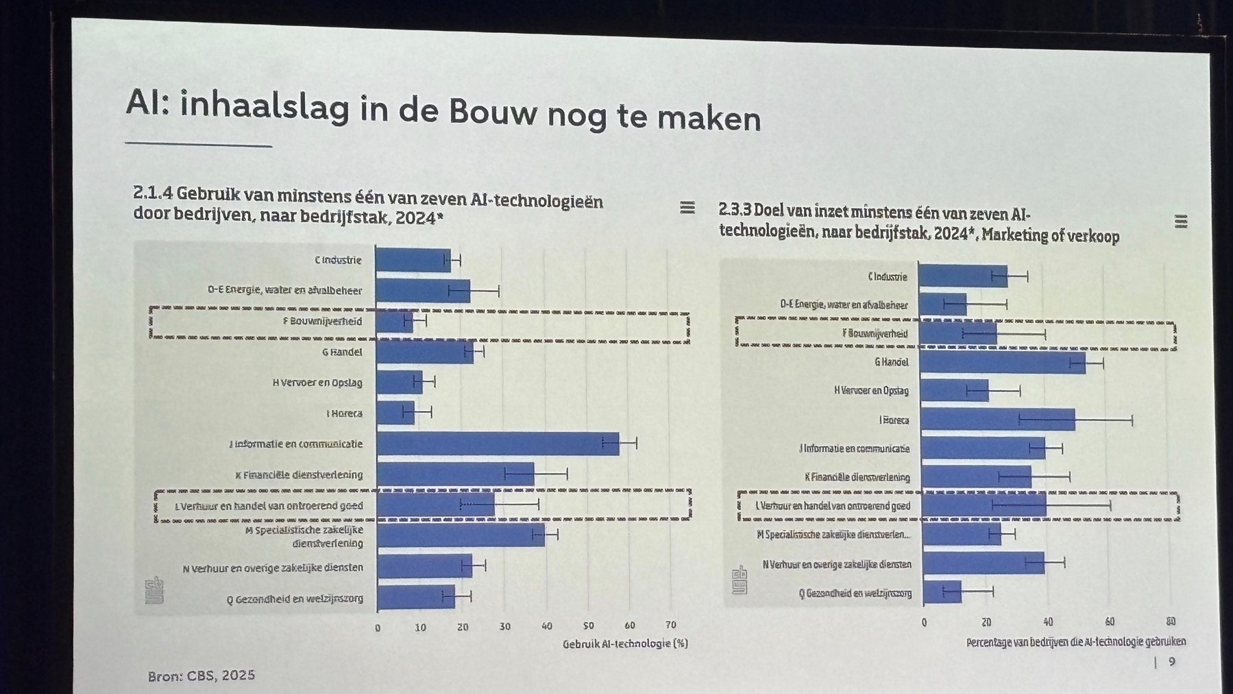 Maar de sector is er nog compleet niet mee bezig. Lokke Moerel (Morrison & Foerster) en Leontien de Waal (ABN Amro) hielden het publiek een spiegel voor. De bouw- en constructie-industrie loopt achter op de digitale transformatie en inzet van AI. Slechts 11% van de industrie maakt gebruik van AI-technologieën. Er is dus nog een wereld te winnen.
