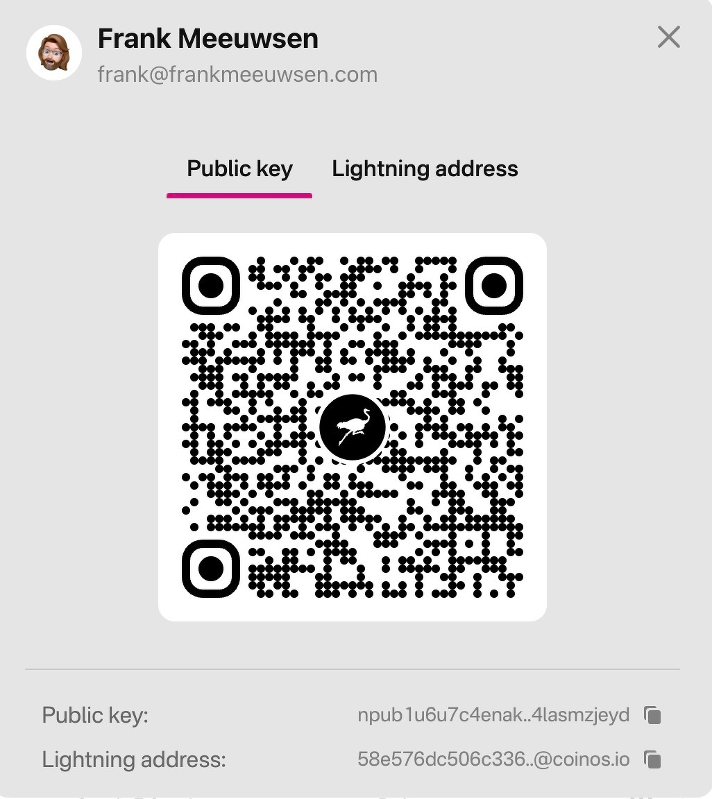Het enige dat jij hebt is een unieke sleutelcombinatie. Een privé sleutel die je bewaart alsof het je huissleutel is én je pincode. En een publieke sleutel die je kunt delen met de wereld. Je hebt dus geen email adres nodig om je te verifieren. Of een telefoonnummer, gezichtsherkenning of een kopie van je paspoort. De sleutelcombinatie zorgt dat de services weten dat jij bent wie je zegt dat je bent. Die sleutelcombinatie is wel weer te koppelen aan een leesbare accountnaam. Zo kun je hier mijn account zien. Maar er is niet één plek waar je dit kunt zien. Als je hier naar mijn profiel gaat en op het QR icoon klikt (links naast de follow-knop) dan zie je er onder een public key. Die kun je bij allerlei nostr-diensten invoeren om te zien wat ik doe.